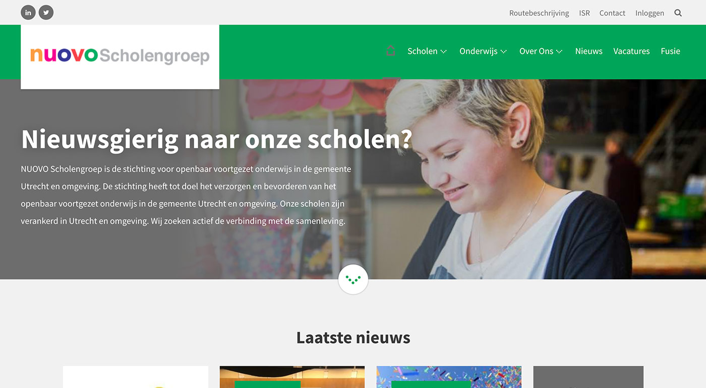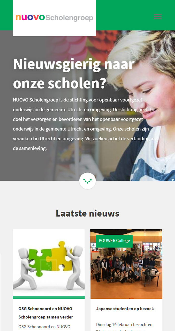 Het bestuur van NUOVO hecht veel waarde aan een eenduidige uitstraling van de scholen. Samen met onze partner Plate hebben we een moedertemplate ontworpen waar elke school zijn eigen identiteit in kwijt kan, maar waarbij uniformiteit van de scholengroep behouden blijft.